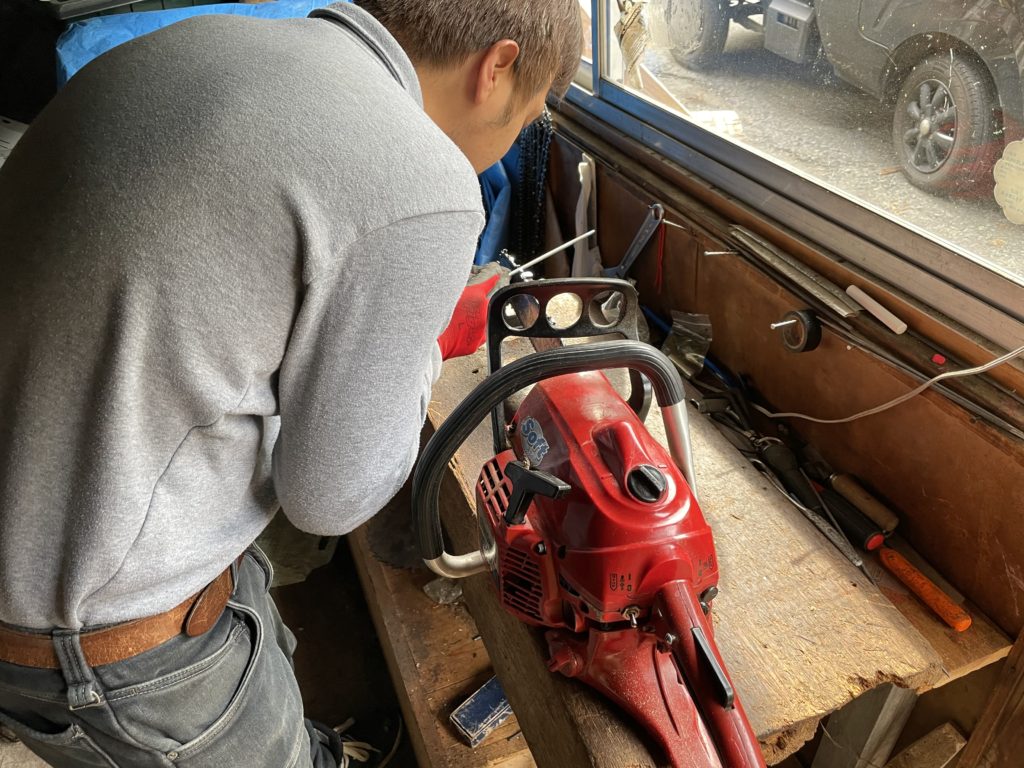 これから材料を切り出しにいくので、その前のメンテナンスとしてチェーンソーの目立てということです(^^)