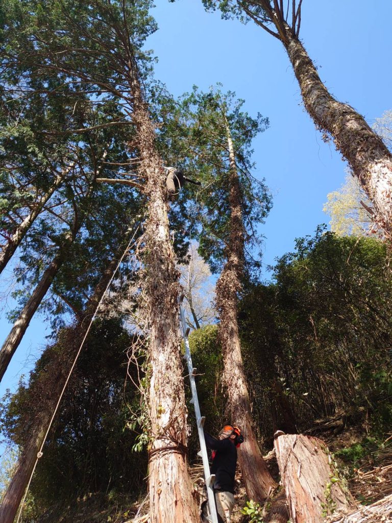 お墓の周りということで、ほぼ周りには墓石があり、伐倒方向がかなり限られ、場合によっては倒すことがなく、高所作業車で少しずつ切っておろしたり、場合によってはお断りさせていただくケースもありますm(__)m