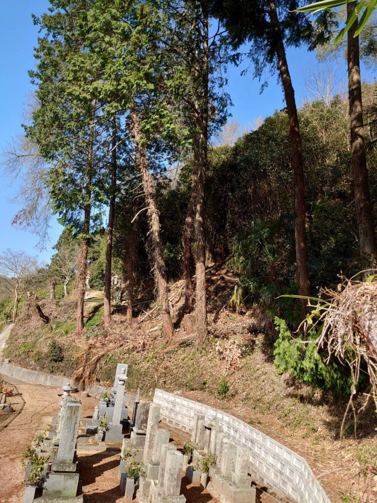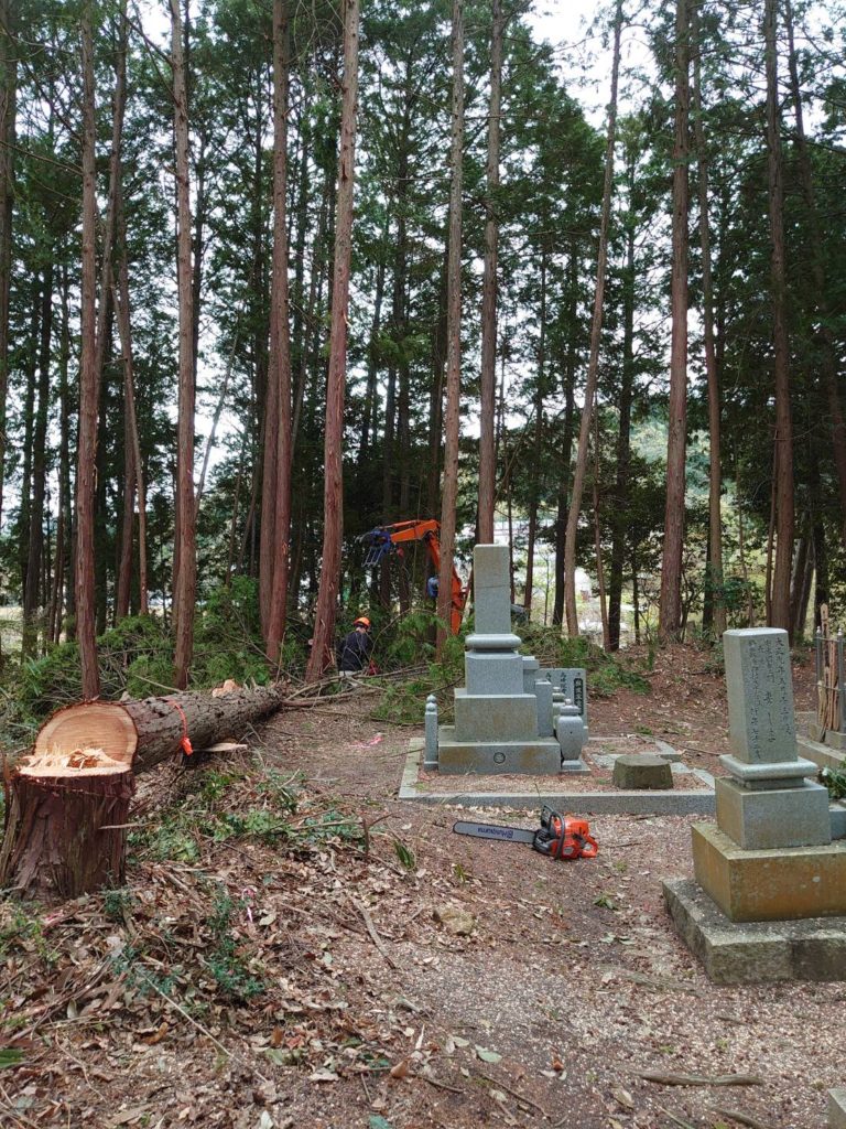 お墓の周りに植えてある?生えてる木が大きくなりすぎて、日が当たらなくなったり、お墓に枝葉が落ちてきて汚れたりしてきたので伐採という運びになったということです!