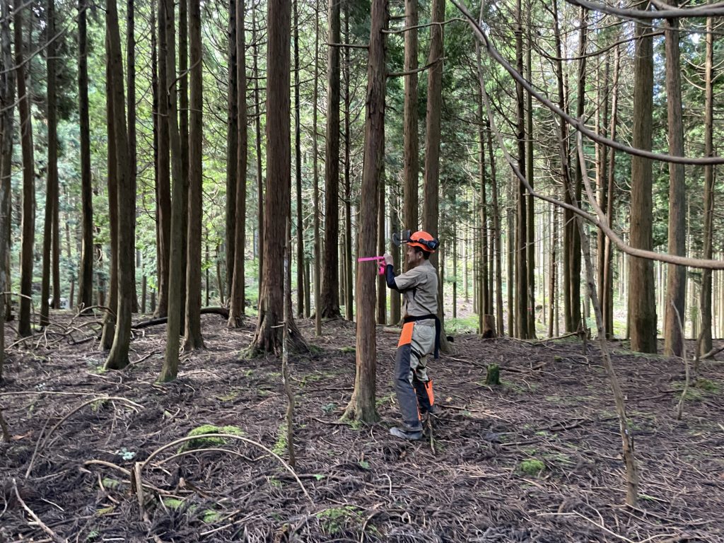 間伐作業前に、あらかじめ密度をみて切る木に印をつけていっています。