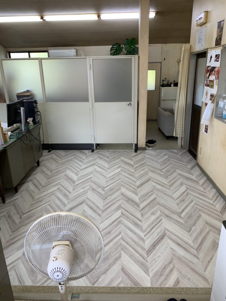 コンパネを貼った後、内装屋さんにヘリンボーン柄に長尺シートを張っていただいて完成です☺