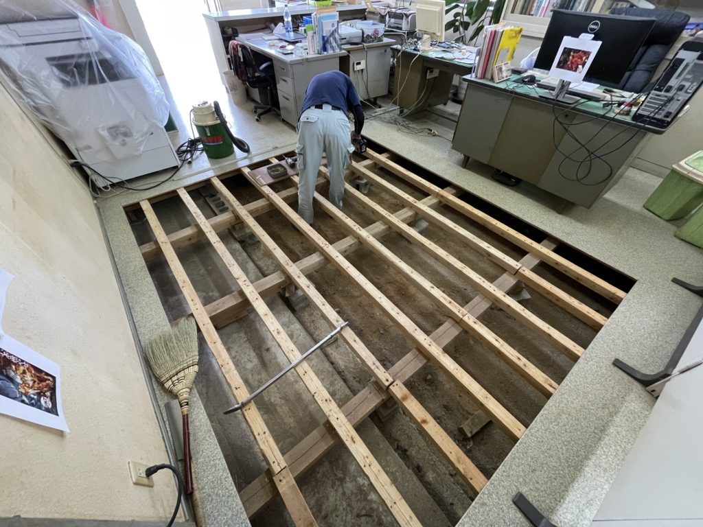 既存の根太はしっかりしていたので、そのまま残し、さらに補強で根太を倍の数に増やしました!