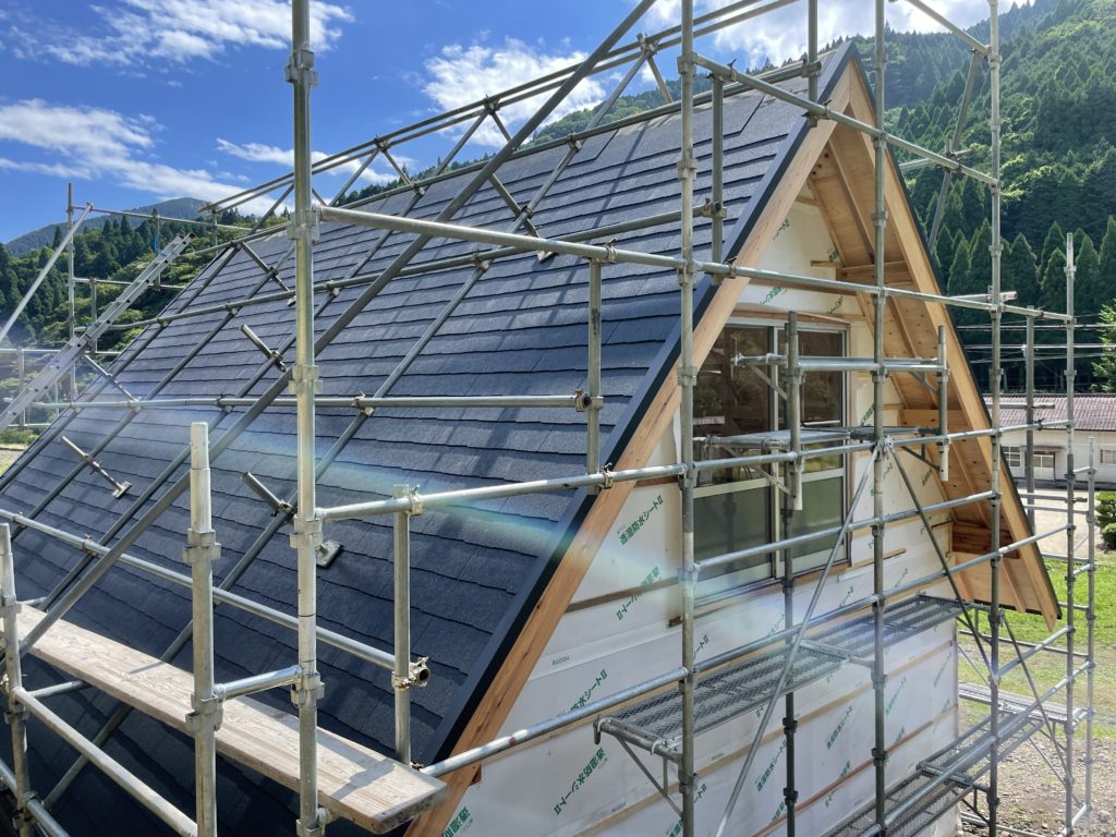 さて、先日棟上げをしました急勾配屋根の倉庫ですが、屋根工事もうすぐ終わりそうです☺