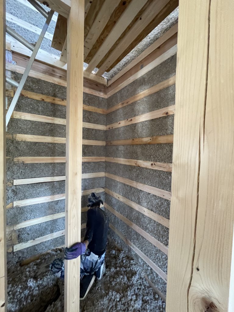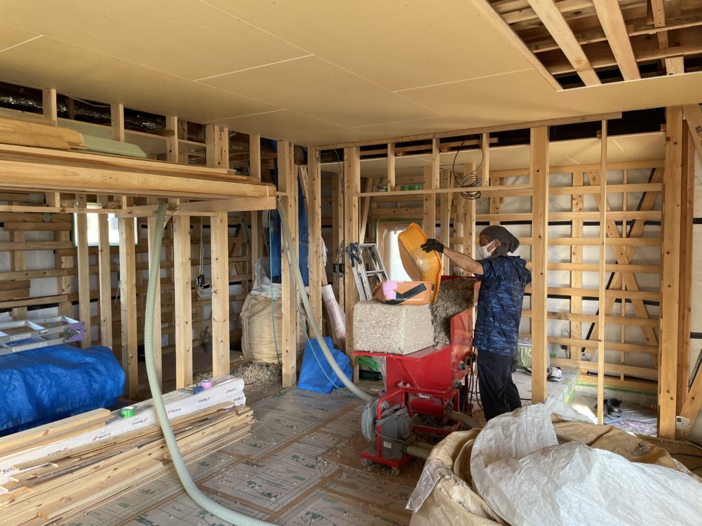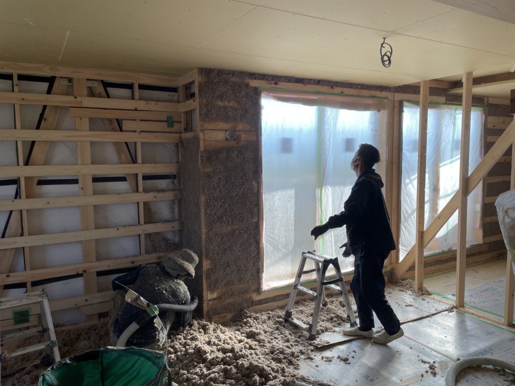 H様邸はセルロースファイバー断熱ですので、専門スタッフが作業します👍