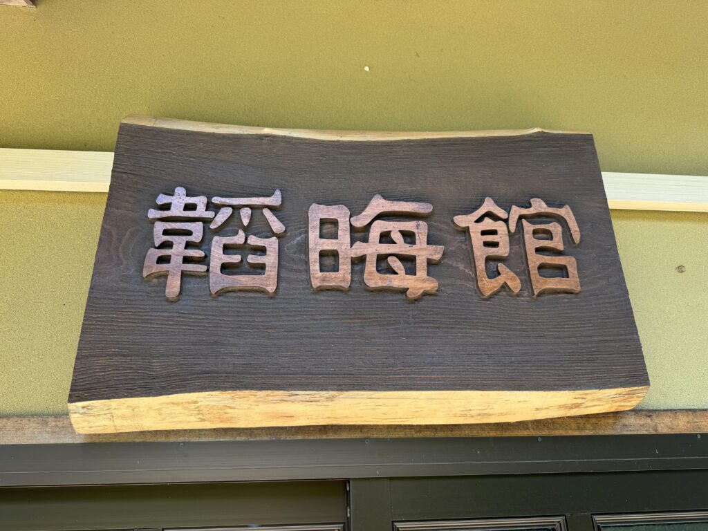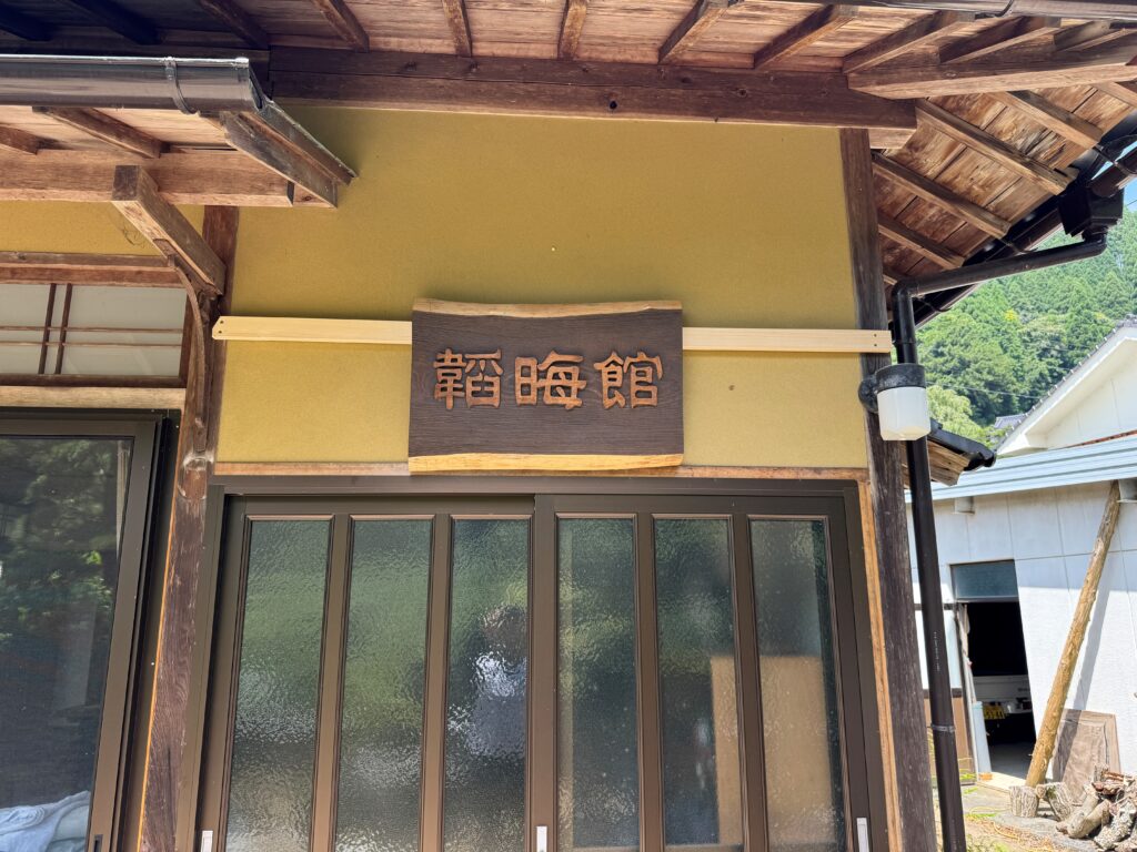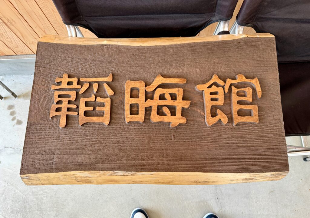 桂の木をウォルナット色で塗装した看板。設置するとこんな感じに