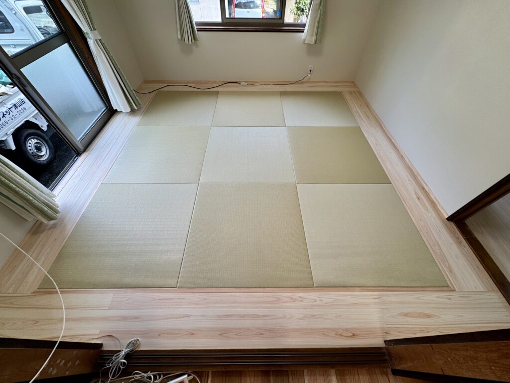 外周をフローリングにしてテレビ台を置くスペースにしたり、あとは視覚的に楽しめる雰囲気になりました。