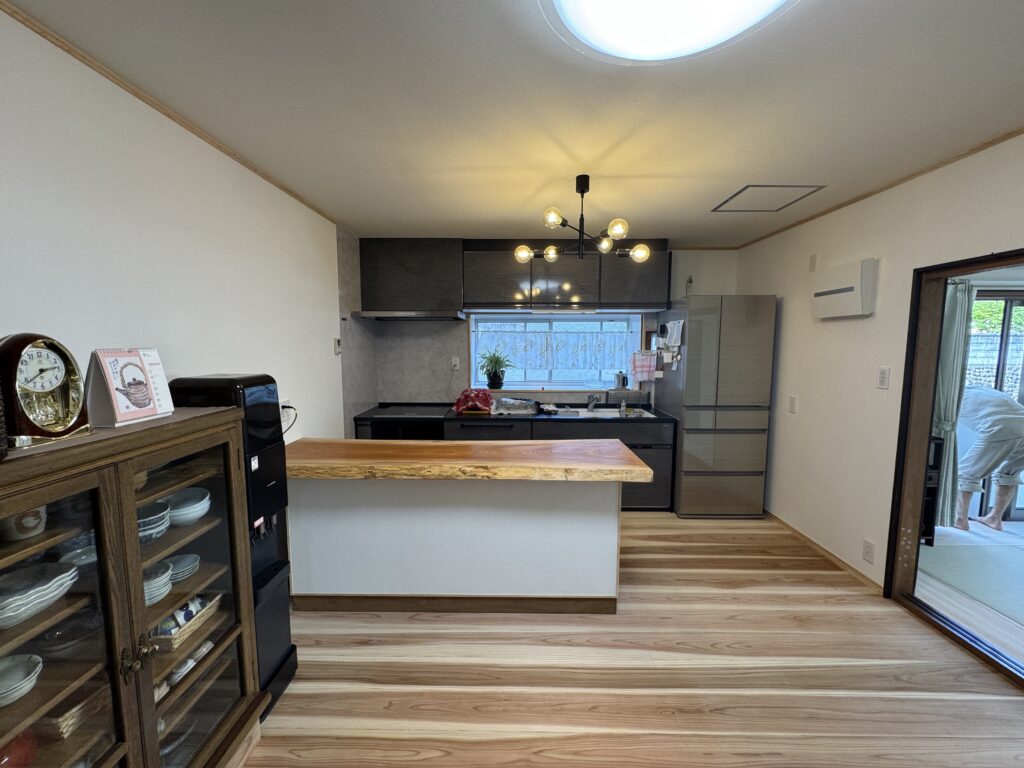 食卓スペースとの境に無垢の一枚板を加工して製作したカウンターを設置しました。